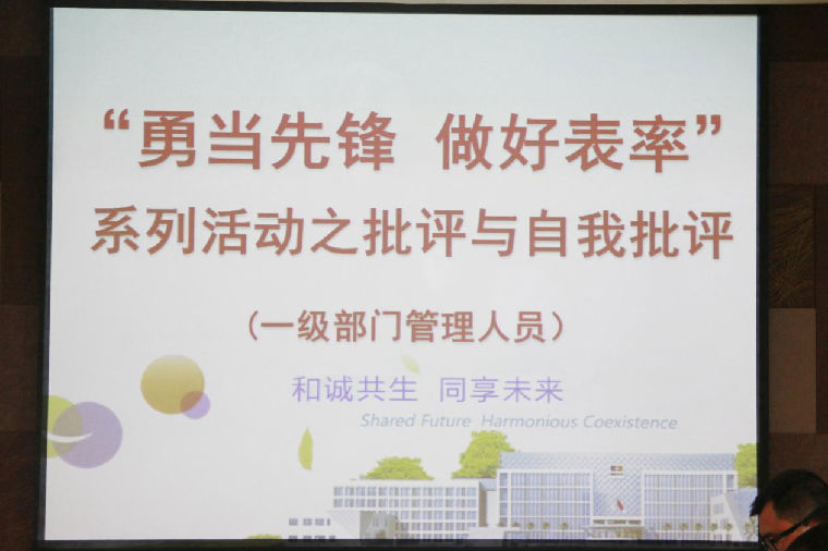 結合企業自身情況,陳益智總經理對所有管理干部提出了五點要求,一是各級干部要嚴格遵守公司紀律和制度,二是要加強自身修養和學習,三是要高標準執行法律法規,四是要在領導干部隊伍中率先垂范開展自我批評,五是要弘揚企業文化和創新精神。為此,陳總號召全體管理干部以批評和自我批評為主要方式,在全公司范圍內開展“勇當先鋒 做好表率”系列活動。